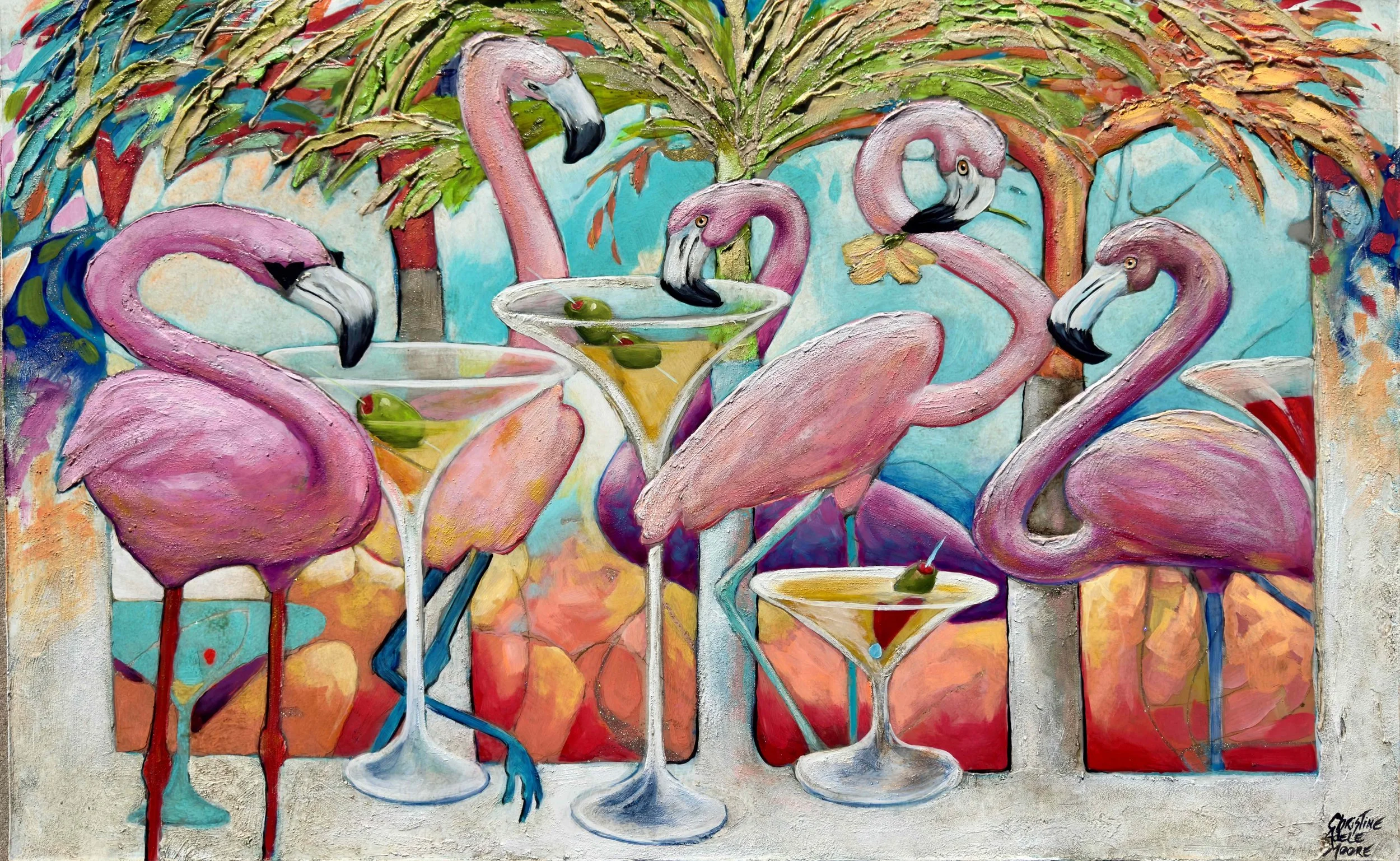 The lighthearted energy of friends enjoying a tropical afternoon. 48” x 32” original mixed media on canvas. SOLD
