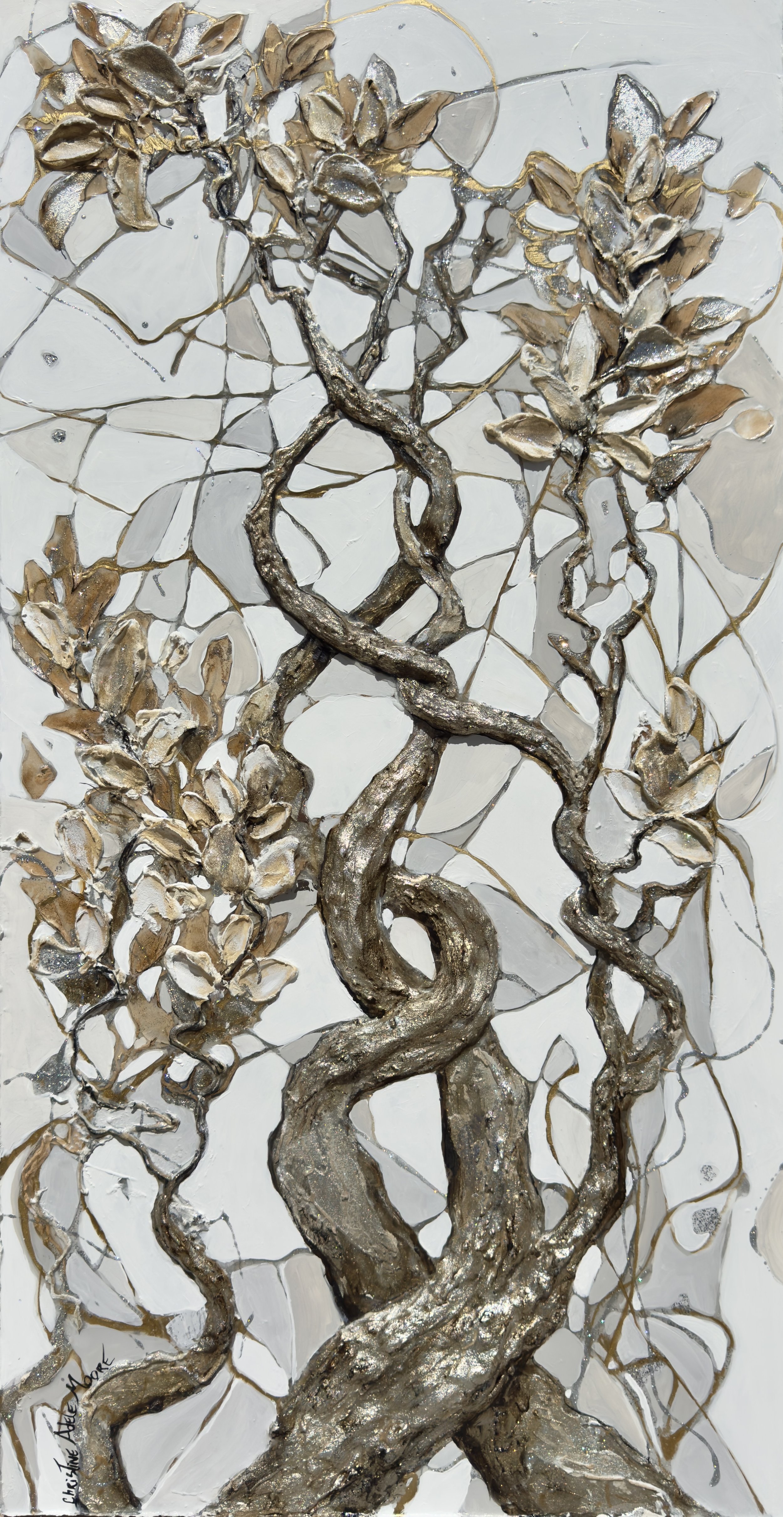 The silver leaf embedded throughout this original mixed media painting creates reflections of the viewer, inviting reflections of one’s past.