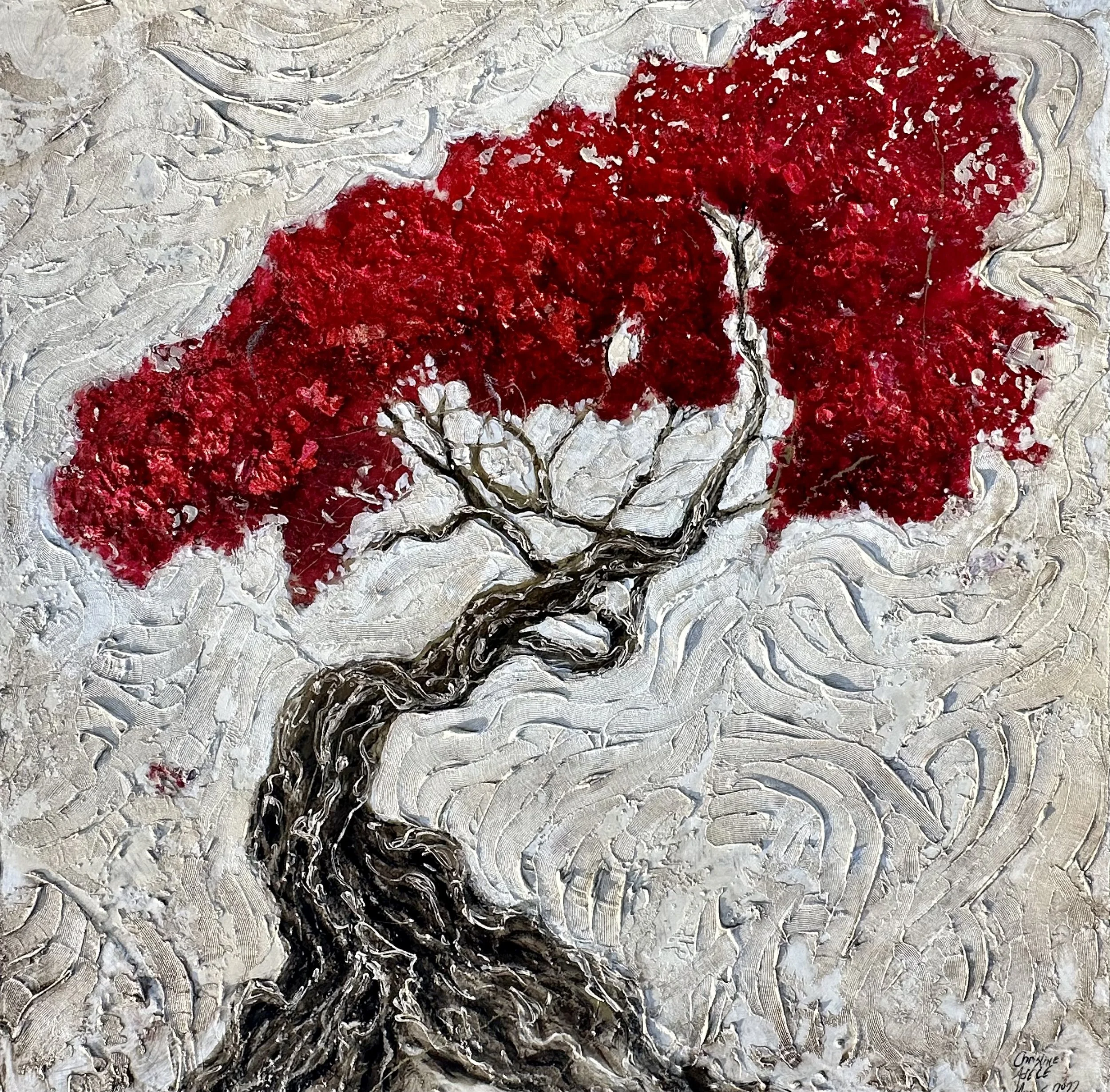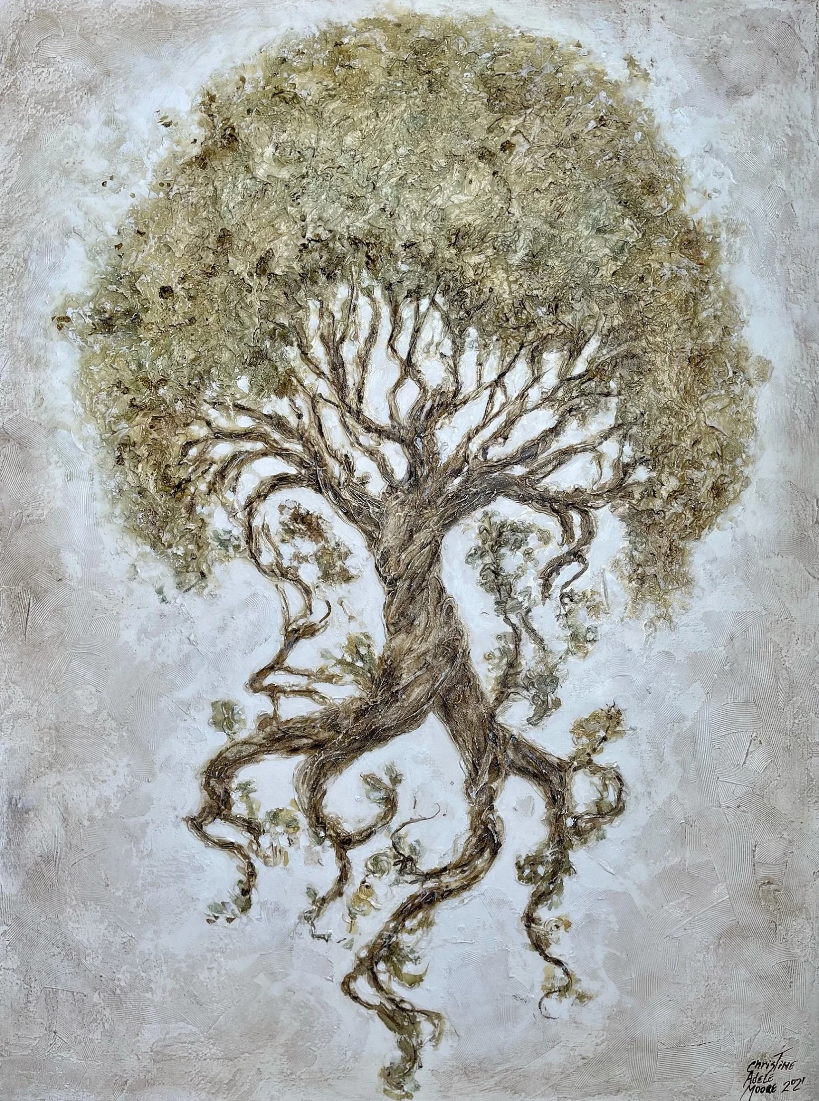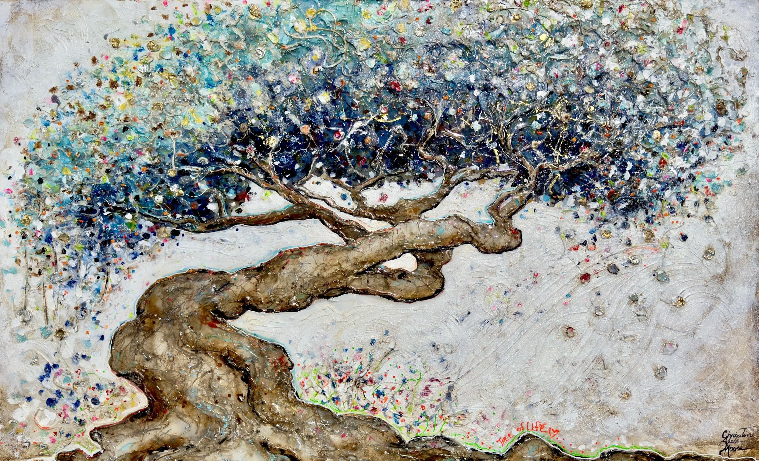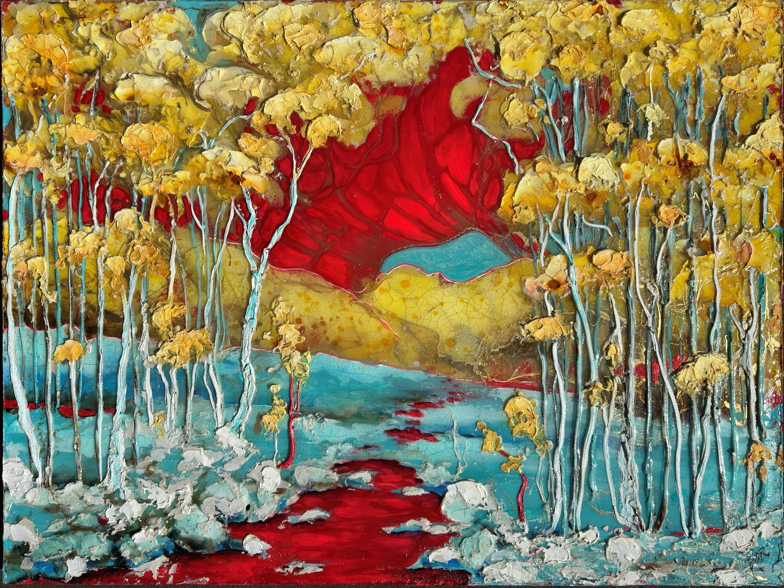 Some paintings flow easily from my soul to the canvas. Some make me wrestle and twist. This was the latter. But as my great grandmother used to say, “pain makes beauty.” I love this heavily textured beast with so many layers of acrylic modeling paste, reflective media, resin, and pure love of these magical trees. 36” x 48” on canvas.